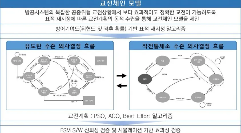 본 연구는 방공시스템의 복잡한 공중위협 상황에서 보다 효과적이며 정확한 요격이 이루어지도록 표적 재지정 기술 및 유연한 교전체인 모델을 개발하고자 한다. 세부적으로는 (1)표적 재지정 과정에서의 요구 조건을 도출하고, 도출된 요구조건을 기반으로 (2)유도탄 수준의 표적 재지정 알고리즘을 설계한다. 이를 확장하여 (3)작전통제소 수준의 표적 재지정 알고리즘을 설계하여 교전계획을 동적으로 수립하여 (4)교전체인을 모델링한 후, (5)모형의 신뢰성 및 효과성 검증을 수행한다. 과제에 대한 구체적인 내용은 보안상 생략한다. 과제에 대한 전반적인 내용은 아래 그림과 같다.