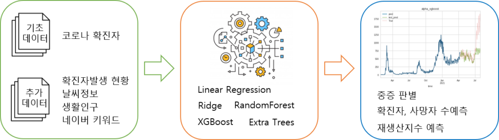 국내에서 처음 코로나 감염자가 발생한 2020년 1월부터 코로나 바이러스는 2022년 4월말까지 변이를 계속해 오면 국내에서만 1700만 여명을 감염시키며 사회 전 분야에 걸쳐 영향을 미치고 있다. 상대적으로 치명률이 낮은 오미크론변이의 확산으로 수년간 지속되어 오던 사회적 거리두기 등과 같은 방역대책이 해제되어 일상으로의 복귀를 앞당기고 있지만 최근 연구결과 및 전문가들의 의견으로는 코로나 바이러스와 같은 신종 바이러스의 창궐 주기가 짧아지고 있어 수년 안에 다시 팬데믹 상황에 직면 할 수 있다고 경고하고 있다. 따라서 추후 발생할 수 있는 감염병에 대응하기 위해서 현재까지 수집된 코로나 관련 데이터와 정부 및 공공기관에서 수집하고 있는 공공데이터 등과 연계를 통해 분석을 위한 데이터셋을 구축하고 이를 다양한 인공지능 기법을 활용해 데이터관점에서의 분석이 요구되는 상황이다. 이러한 분석은 추후에 발생할 수 있는 감염병 상황에서 실시간으로 수집되는 데이터를 통해 감염병 대응을 위한 체계 구축에 도움이 될 것이다.